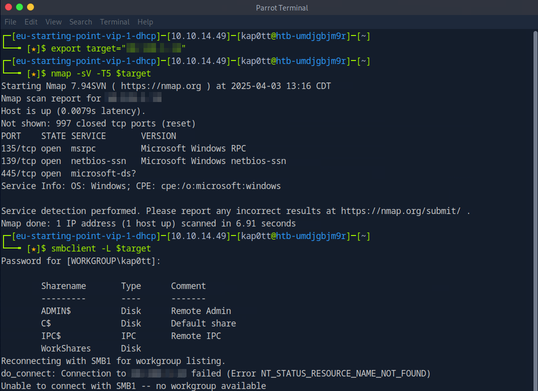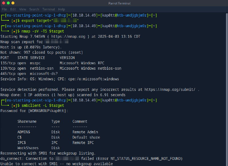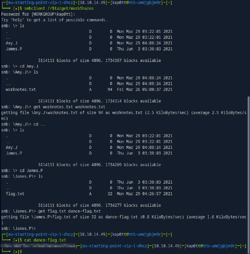 Box number 3 in the HTB intro, dancing is about a SMB share which requires no password to connect to, containing a “root” flag. After a short “man smbclient” to look up some of smbclient’s REPL commands, I quickly acquired the flag.